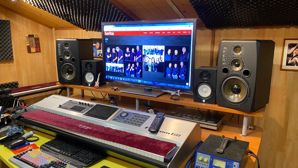 Casa Dau, a Sassari, è un edificio dei primi anni del Novecento. In questo palazzo antico si respira la storia della città, sin dalla rampa di scale dai gradini alti che percorriamo per arrivare allo studio di registrazione dei Bertas. Mi accompagna l’amico Salvatore, che della più longeva band sarda è grande fan. Ciò che da subito mi colpisce è il collage di fotografie, tantissime, attaccate al pannello esposto sulla parete. Il passato dei Bertas è lì, in quei visi di ragazzi, nei capelli e negli abiti degli anni Settanta e ora, oggi, in tutti quelle esperienze impresse sui loro volti. In tutti quegli aneddoti racchiusi in quegli scatti. Quante storie, quante vite.